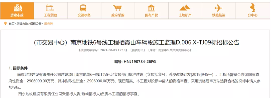 近日,南京市公共资源交易平台发布了南京地铁6号线工程栖霞山车辆段施工监理D.006.X-TJ09标招标公告。