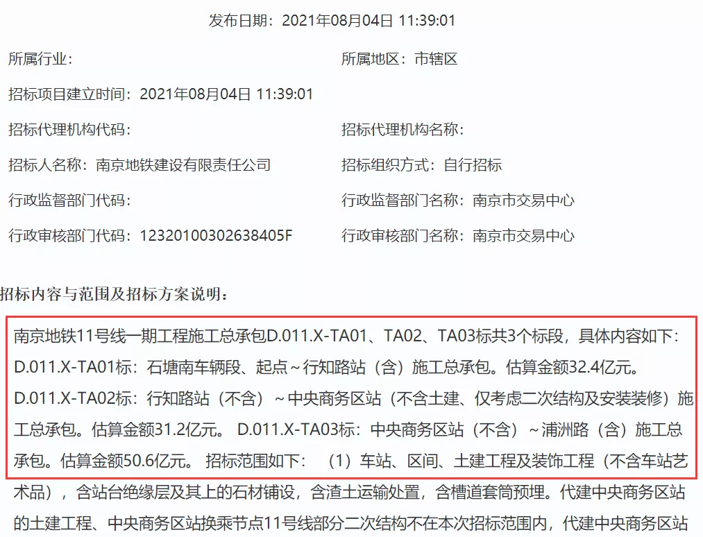 8月4日,地铁11号线一期工程工程施工总承包开始正式招标,根据文件显示,南京地铁11号线一期工程施工总承包D.011.X-TA01、TA02、TA03标共3个标段。预计总金额达到114.2亿元。