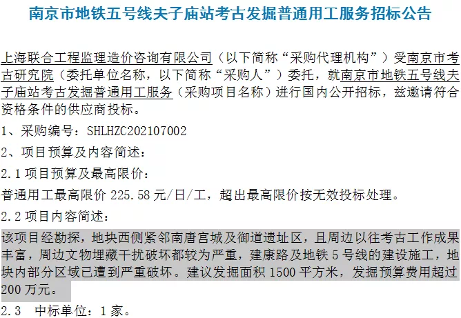招标公告显示,地铁5号线夫子庙站地块紧邻南唐宫城及御道遗址区,且周边以往考古工作成果丰富,周边文物埋藏干扰破坏严重,建康路及地铁5号线的建设施工,地块内部分区域,已遭到严重破坏,需要抢救和保护已经被严重破坏的文物。