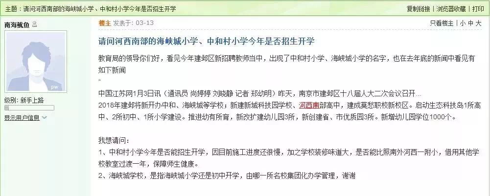 就在3月19日,建邺区政府网络发言人回复了这个问题。官方表示,中和村小学由于恶劣天气影响,目前的建设进度较慢,主体工程尚未竣工,今年开办的条件很难具备。海峡城小学还没有开建,海峡城初中的生源数量严重不足,基础建设虽基本完成,但内部建设尚在进行中,不具备开办的条件。2018年建邺区招生工作实施方案还在加紧调研制定中,预计4月9日—13日之间发布。