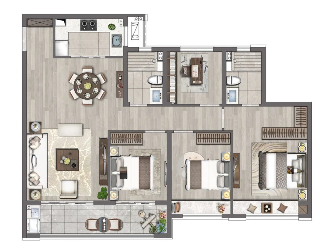 建筑面积约123㎡户型四房两卫设计,四开间朝南,约6.5米面宽双阳台设计保证采光,同时主卧带独立卫浴、衣帽间设计,极大提升居住舒适度。