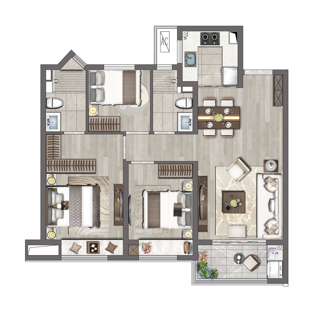 建筑面积约89㎡户型打造三房两厅两卫,主卧套间的设计,自带独立卫浴和衣帽间,两个卫生间让生活更加方便,即便是刚需小户型也“五脏俱全”。加上三开间朝南设计,南向约270°的宽幕阳台,保障了采光率和居住的舒适度。
