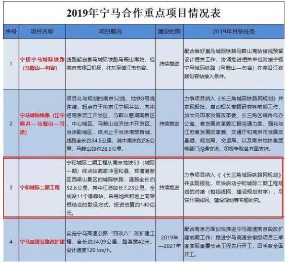 就在今天,我在公司闲得无聊,突然发现一份马鞍山市政府近期官方发布的《马鞍山市2019年宁马合作重点项目情况表》,在这份表格里面,宁和城际二期工程被重点提及。