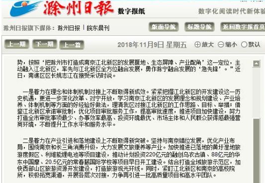 据滁州日报报道,去年,滁州南谯区区长姚志江在接受采访时表示:南谯区将充分发挥紧邻南京江北新区的优势,按照‘把滁州市打造成南京江北新区的发展腹地、生态屏障、产业配角’这一定位,主动融入江北新区,率先与江北新区全方位融合发展。