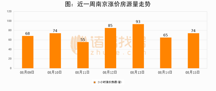 根据诸葛找房数据显示,南京24小时涨价房源量为74套,较08月14日增加9套,环比上涨13.8%。与此同时,涨价房源占比小幅扩大,业主信心有所提升。