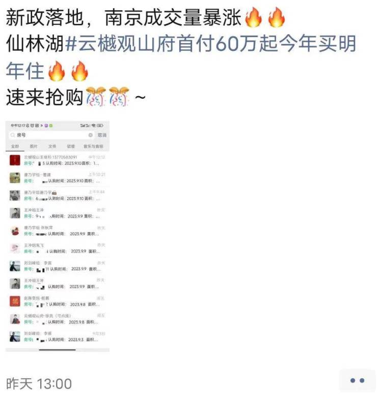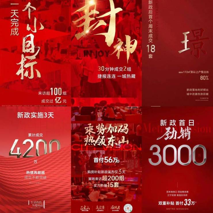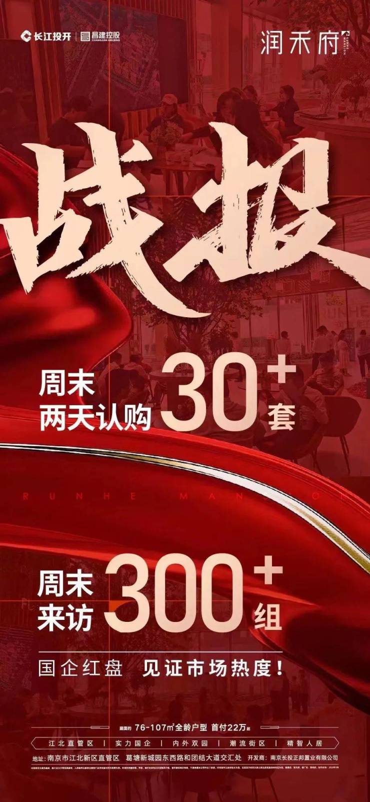 城东金基璟樾府周末两天卖了18套;城南中心天悦锦麟30分钟成交2组,周末两天热销15套,累计来访300+;海信慧园新政实施3天累计成交4200万;正方新城玖华府新政首日卖了3000万;江宁东山万科都荟启境来访超200组,热销15套......