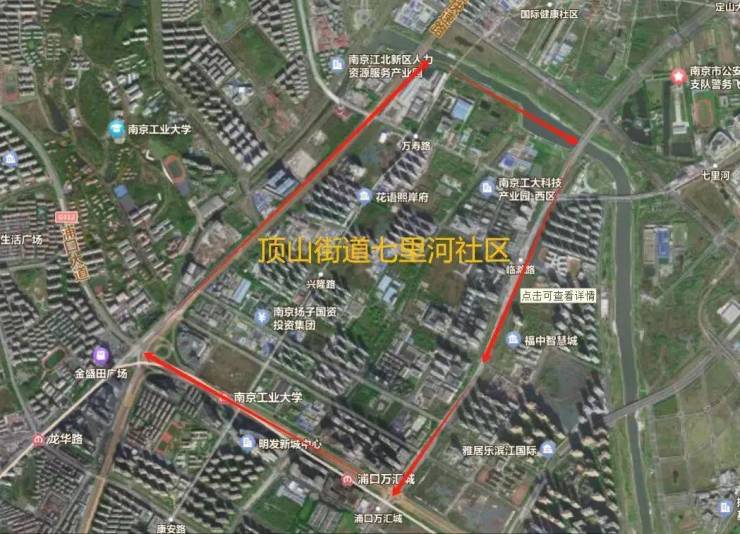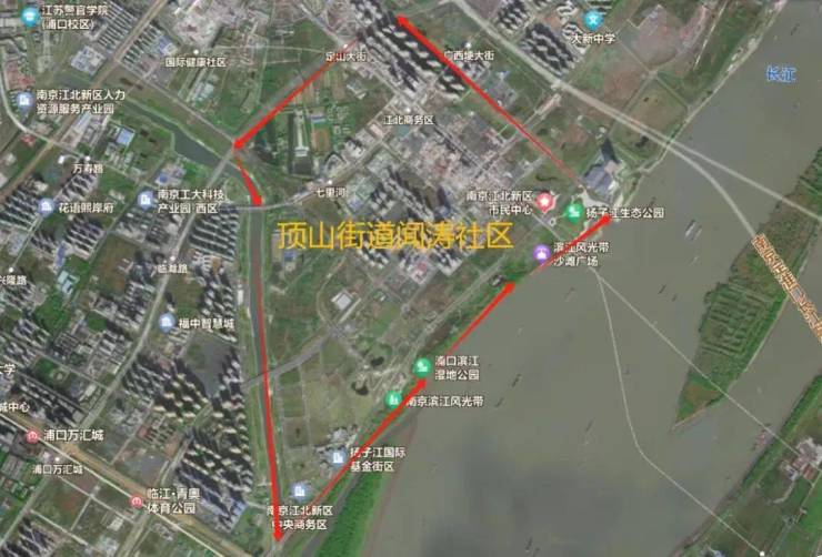 北起城南河与滨江大道交汇口,沿滨江大道向南至南京江心洲长江大桥接横江大道,沿虎桥路向西至浦乌北路、南京江心洲长江大桥,沿浦滨路向北接城南河。