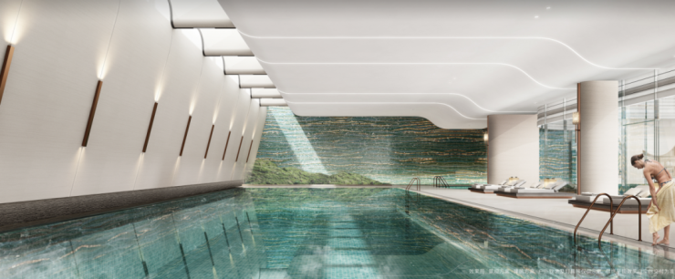 泳池采用仿意大利BISAZZA马赛克带金丝,营造出艺术性与度假风并存的奢适感。池底需要纯手工铺贴BISAZZA,每个工匠一天人工费用就要3000块。