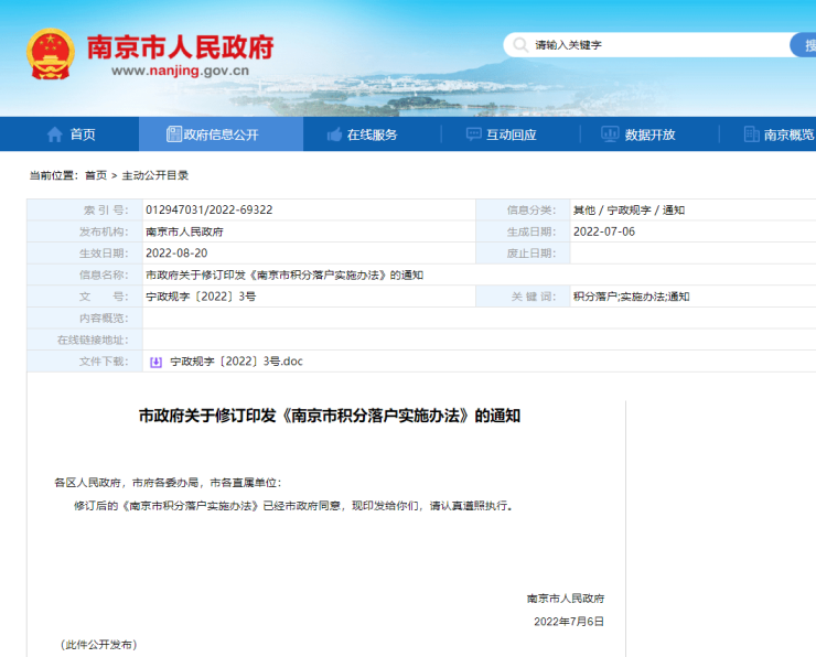 5.本办法自2022年8月20日起施行。2021年7月27日市人民政府发布的《南京市积分落户实施办法》(宁政规字〔2021〕2号)同时废止。