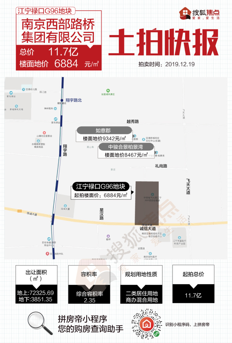 7、禄口G96地块经过1轮竞价,被江宁交通建设集团拿下,成交楼面价6884元/平。