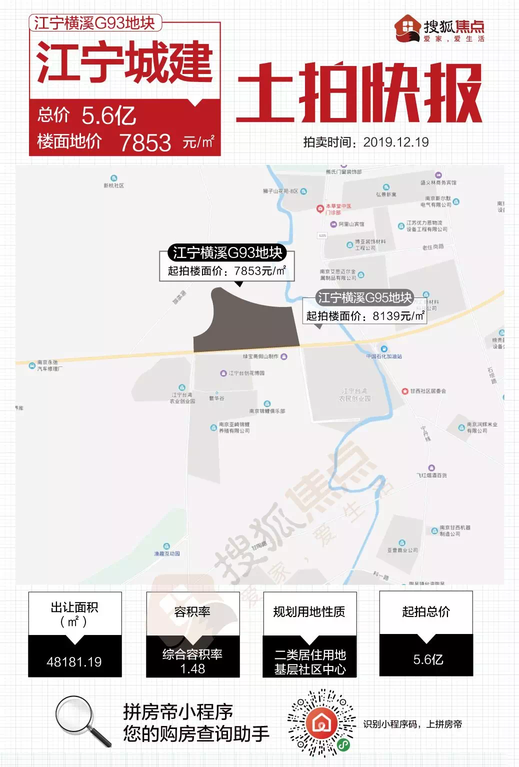4、横溪G93地块经过1轮竞价,被江宁城建拿下,成交楼面价7853元/平。
