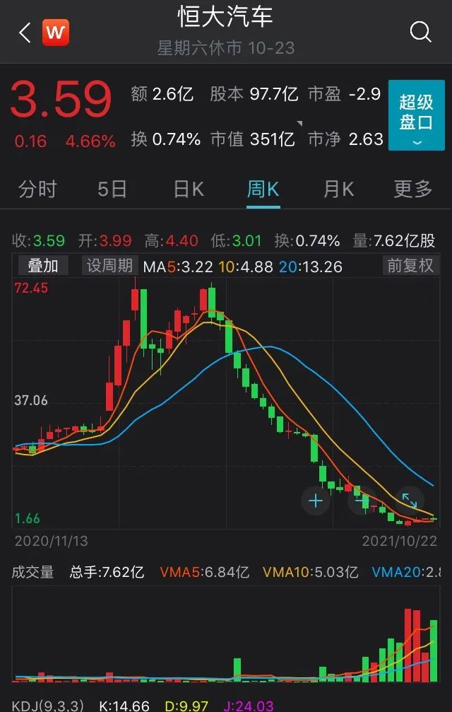 股价方面,自2020年8月恒大健康更名为“恒大汽车”以来,公司在很短时间内市值冲破2000亿港元,跃居国内整车上市公司前三名。今年4月19日,恒大汽车创下了70.85港元的高价,登顶之后股价一路下滑。截至10月22日收盘,恒大汽车报收3.59港元,市值351亿港元。