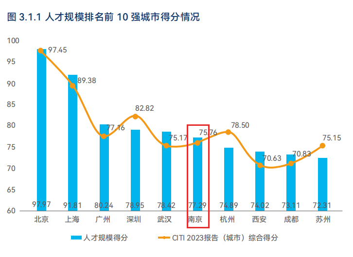 报告中提到,南京拥有两院院士数和科技创新领军人才数在上榜城市中分别位列第三和第四,排名靠前。近年来,南京通过实施“宁聚计划”吸引青年人才聚集发展,2022年全市人才资源总量达到356万人,进一步扩大了人才规模。