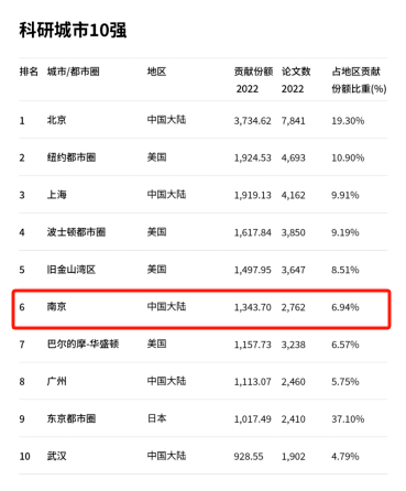 其依据为城市及地区2022年在自然指数(Nature Index)所追踪的82种自然科学期刊上的科研产出情况。中国科研城市在自然指数中的表现持续上升,北京在世界领先的科研城市中继续保持首位;南京跃升至第6位,刷新了连续四年全球第8的记录,在国内仅次于北京、上海。