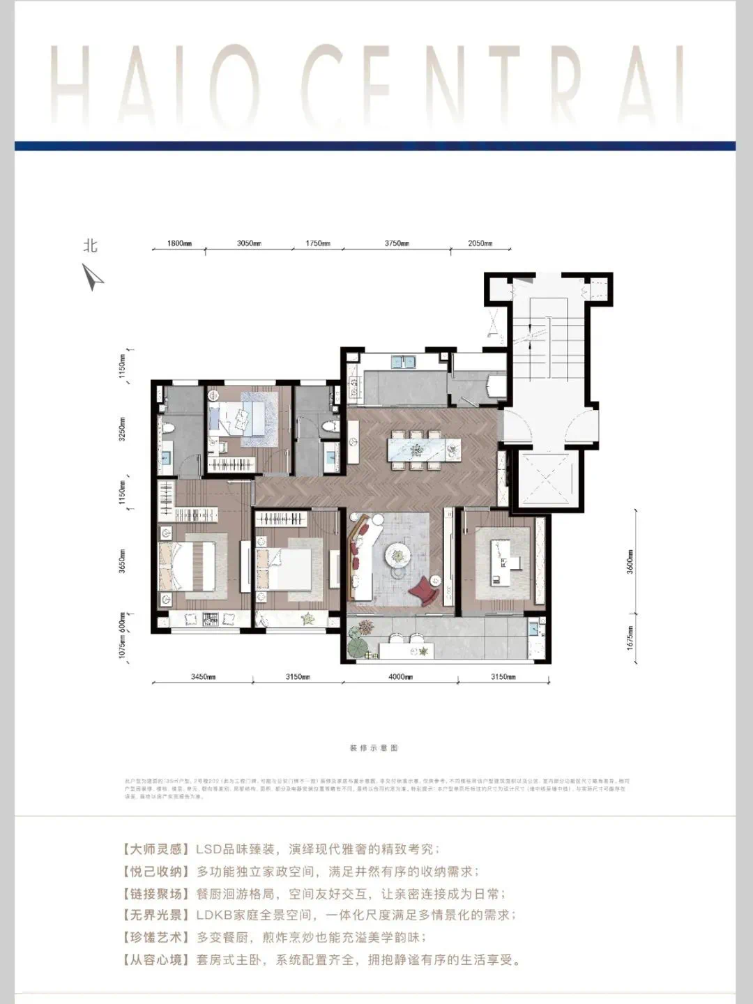 在升级精装标准方面,三大件齐全,包含中央空调是大金或同等品牌、新风系统是霍尼韦尔或同等品牌、地暖是博世或威能等同等品牌。除此之外还有西门子、摩恩、汉斯格雅、唯宝等知名品牌。
