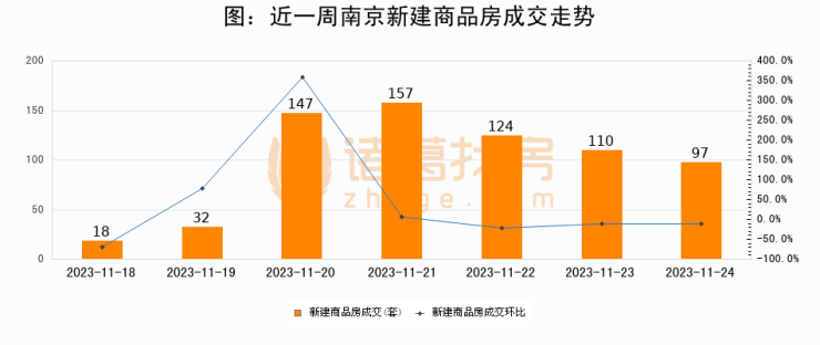根据南京市住房保障和房产局数据显示,2023年11月24日南京新建商品房成交97套,较昨日减少13套,环比下降11.8%