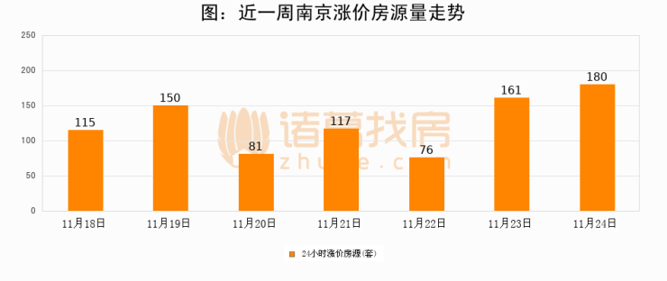 根据诸葛找房数据显示,南京24小时涨价房源量为180套,较11月23日增加19套,环比上涨11.8%。与此同时,涨价房源占比小幅扩大,业主信心有所提升。