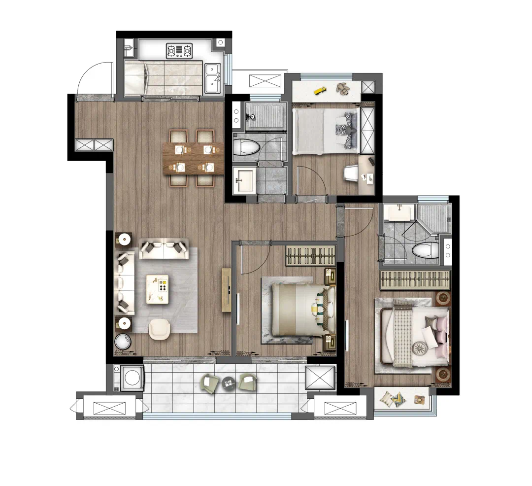 目前在售5、7、8、9、10、12号楼,主力户型面积约83、103、125㎡,其中83平三房性价比超高,总价约150万起。125㎡户型更是做到了四房两厅两卫,四开间、三卧室朝南设计,并且朝南卧室都带独立飘窗。