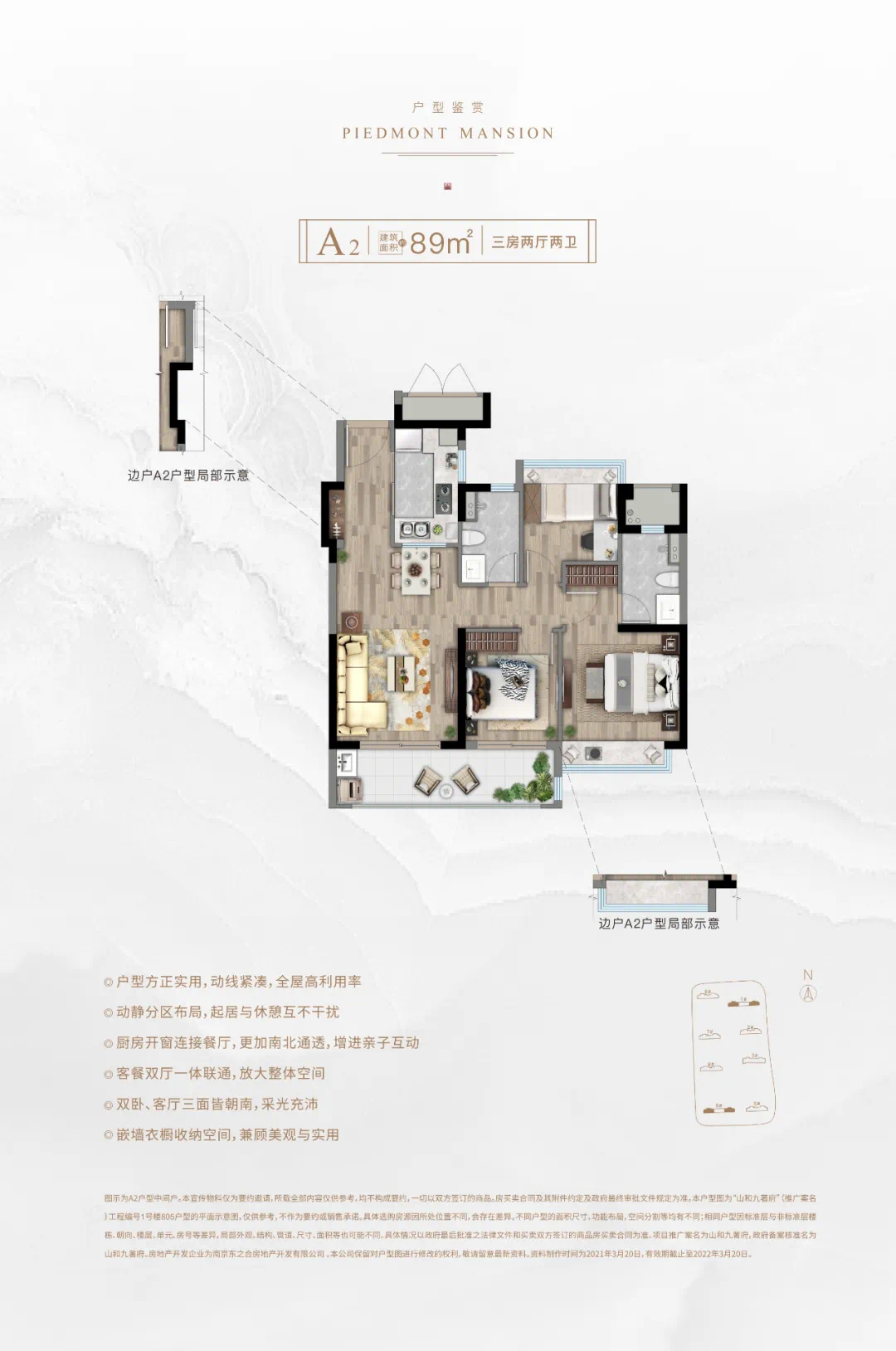 首先要说的自然是建面约89㎡王牌户型,不仅做到了三房两卫设计,而且双开间阳台。