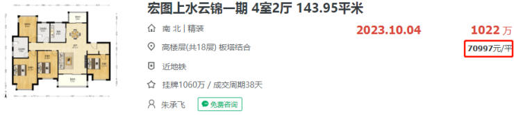 河西中的宏图上水云锦,一套143.95㎡房源,成交总价1022万,成交单价7万/㎡,仅用了38天就成交了。