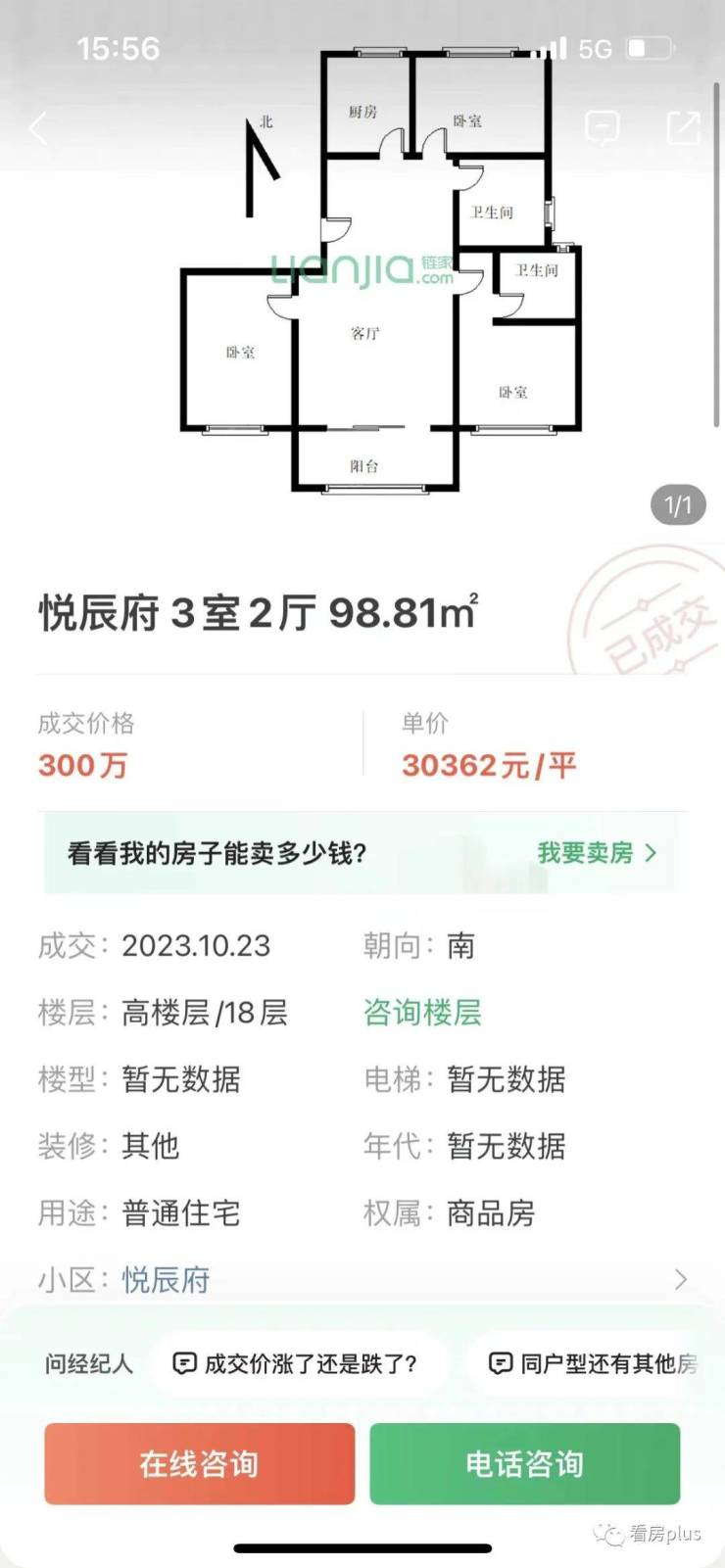 此外,前不久悦辰府也成交了首套二手房,户型建面约98.81㎡,成交总价300万,折合单价约30362元/㎡。而悦辰府2019年底新房价格约3.1-3.3万/㎡,这又是一套亏本的。