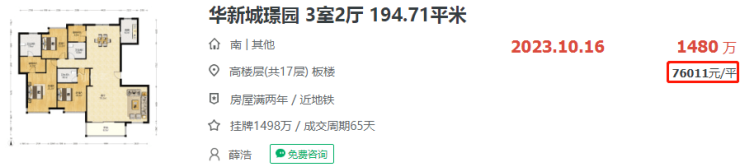 河西中的华新城璟园新成交了一套194.71㎡的房源,成交总价1480万,成交单价7.6万/㎡,房价一如既往的坚挺。