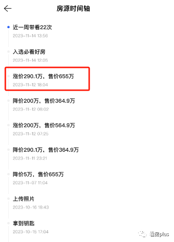 根据调价过程来看,从11号晚上23点到12号晚上18点,不到24小时的时间内,业主先是降价290万,然后又涨200万,紧接着不到1小时后又降价200万,10个小时候又涨回原价655万,折合单价约5.2万/㎡......