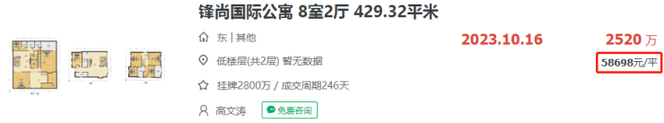 南京老牌科技豪宅锋尚国际公寓,429平,成交总价2520万,成交单价5.8万/㎡,创下小区今年的最高成交价。
