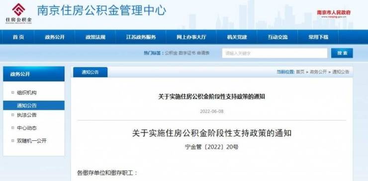 6月8日,南京住房公积金管理中心官方发布通知,实施住房公积金阶段性支持政策