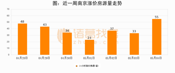根据诸葛找房数据显示,南京24小时涨价房源量为55套,较05月03日增加22套,环比上涨66.7%。与此同时,涨价房源占比小幅扩大,业主信心有所提升。