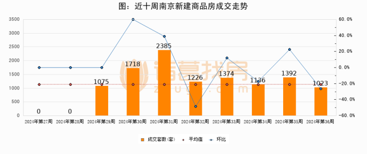 进入2024年第36周(09月02日-09月08日),南京新建商品房成交1023套,较上周减少369套,环比下降26.5%