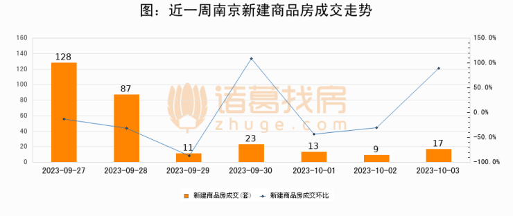 根据南京市住房保障和房产局数据显示,2023年10月03日南京新建商品房成交17套,较昨日增加8套,环比上涨88.9%