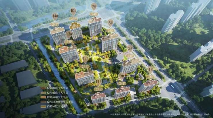 整个项目共计10栋23-24层现代高层住宅,围合式布局,退让出占地约3万方景观,带有约20000㎡纯正围合式中央景观花园,南北纵向约200米超大中庭。