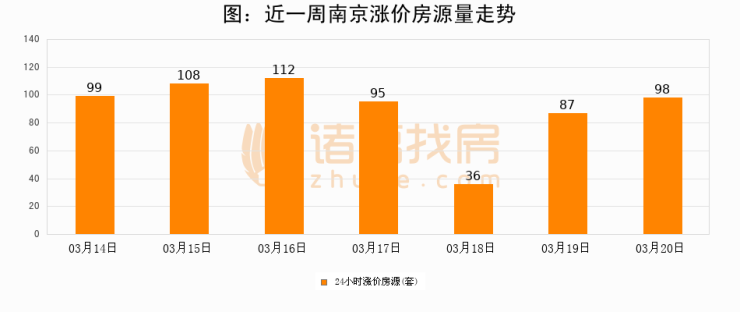 根据诸葛找房数据显示,南京24小时涨价房源量为98套,较03月19日增加11套,环比上涨12.6%。与此同时,涨价房源占比小幅扩大,业主信心有所提升。