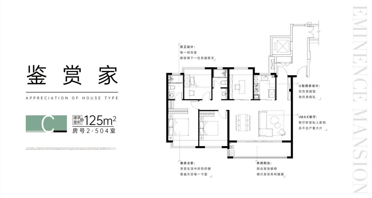 约125㎡四房两厅两卫,四开间朝南,南北通透,双阳台设计,大面积采光;长面宽、短进深设计,减少空间浪费,拥有品质项目流行的大横厅,提高空间感及舒适性。