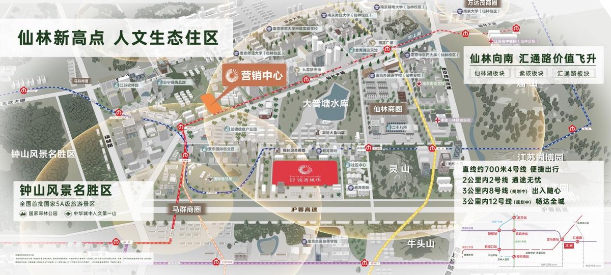 项目身居南京第三代富人区——仙林南腹地,占据城市优质资源。比邻4号线,近享2号线与规划中的12号线/8号线,城市路网发达,出行便捷。3大商圈、5座大型综合体及酒店、2大医院贴身近侍,仰止都会生活。咫尺在建幼儿园与规划小学,教育完备。紫金山、灵山、仙林湖公园、羊山湖公园等山湖盛境在侧,静享诗意生态谧境。