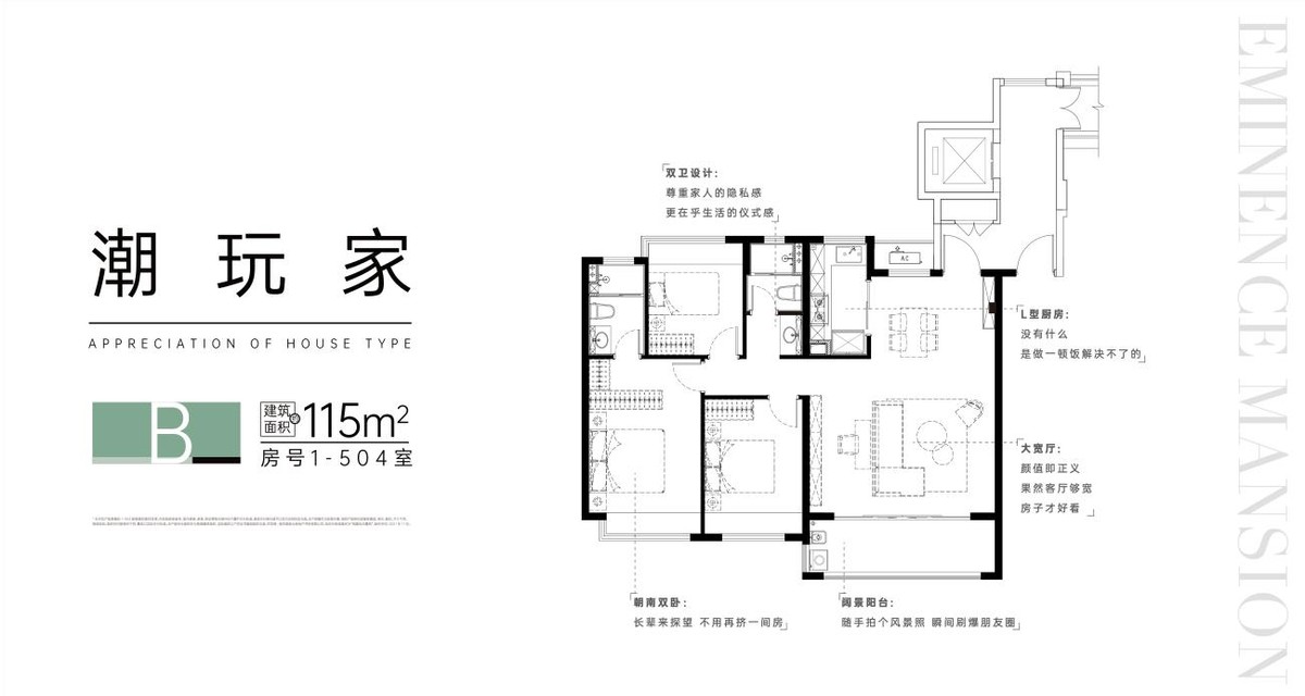 约115㎡三房两厅两卫,南侧大宽厅连接270°大阳台,采光效果佳;南向主次卧各带飘窗;主卧套房设计,带独卫和衣帽间,空间布局开阔。