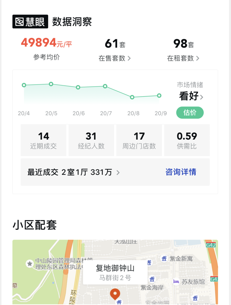 项目周边有地铁2号线马群站,安居客较新数据显示,复地御钟山二手房挂牌均价已近5万/㎡。
