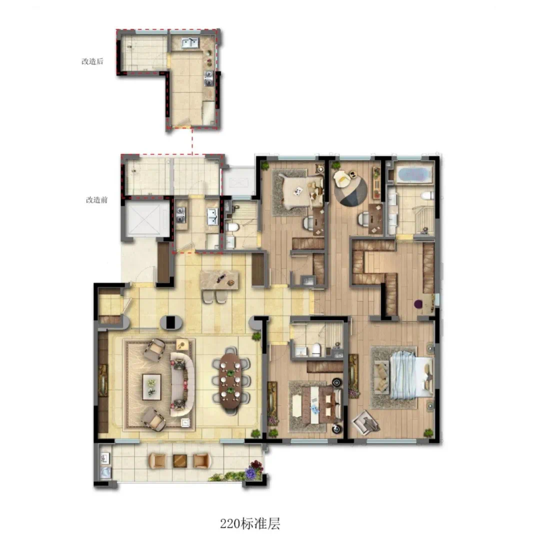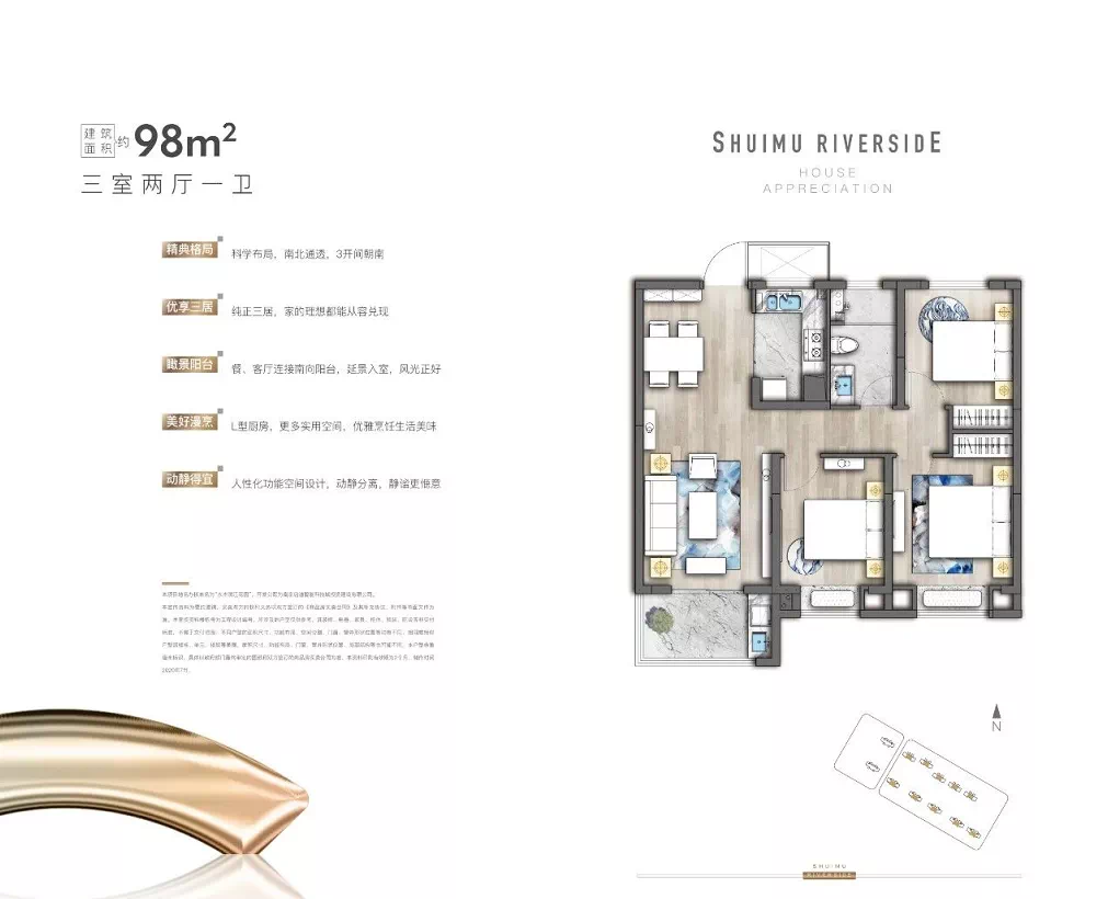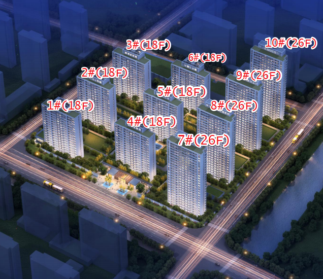 户型建筑面积有98㎡、120㎡、127㎡、140㎡、160㎡,220㎡,其中220㎡是顶楼江景大平层,项目楼间距68-86米,得房率约78-82%。