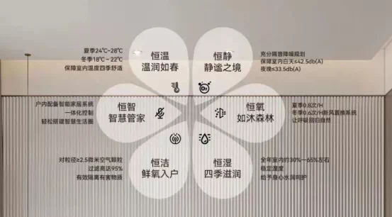 项目打造科技住宅,采用地源热泵+毛细管网+置换式新风系统,具备恒温、恒氧、恒湿、恒洁、恒静、恒智功能。