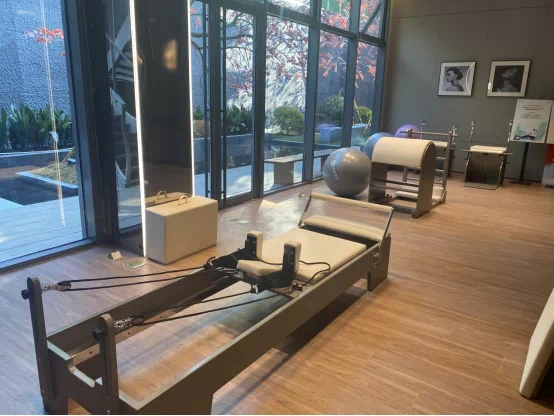 健身区设置了健身单车、瑜伽球、瑜伽垫、划船机等健身设备,麻雀虽小五脏俱全。