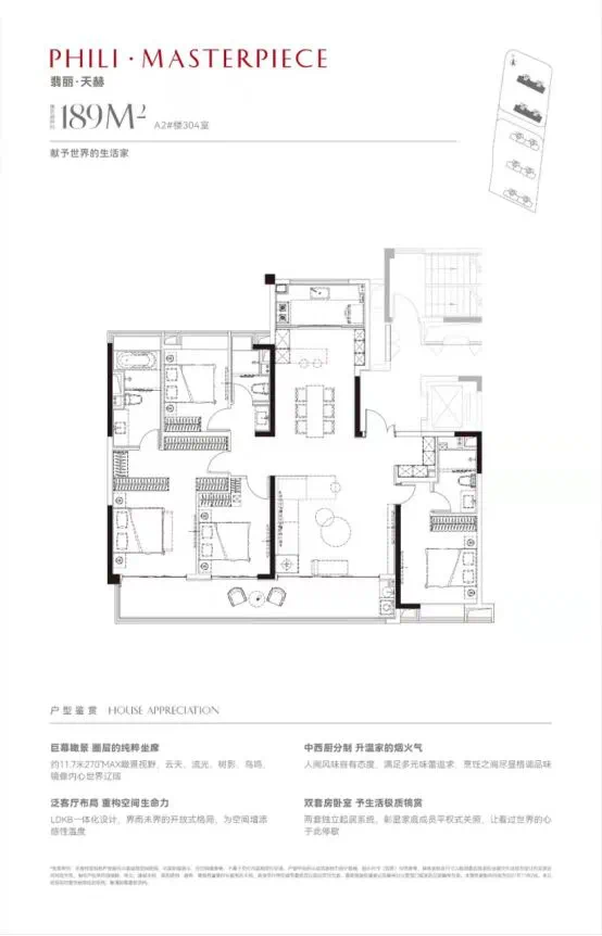 2.项目打造5栋18-19F高层住宅,仅有两种户型:建面约162㎡四室两厅两卫、189㎡四室两厅三卫,是四叶草中起步户型较大的。今天血拼姐参观了即将加推的189㎡精装升级包样板间,阳台整面双层玻璃落地窗,转角设计采光无敌!