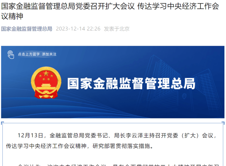 此外,12月13日,金融监管总局党委书记、局长李云泽主持召开党委(扩大)会议,传达学习中央经济工作会议精神,研究部署贯彻落实措施。