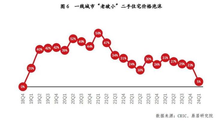 而到了今年一季度,该泡沫仅为5%,意味着历时三年,一线城市“老破小”二手房价格泡沫基本消除,二手房价格回归健康状态。这很大程度上也代表了全国二手房价格泡沫的基本消除。
