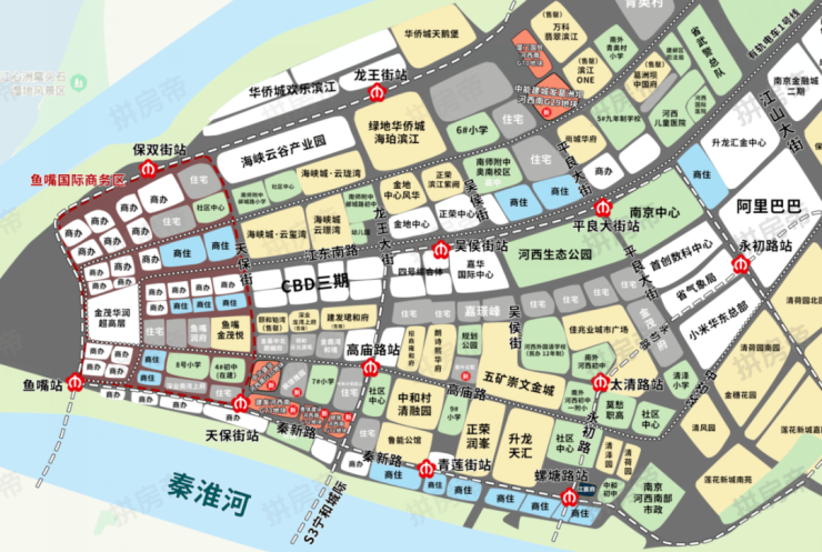 河西南在江东南路与江山大街交汇的东南向区域,规划了大面积的科创产业区,以阿里、小米、58、洋河四大总部基地建设为核心,总体进度符合预期。