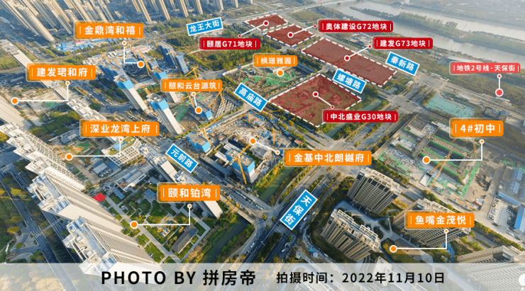 时至2022年11月上旬,高庙路、螺塘路两侧都出现大量住宅项目。金基中北朗樾府、颐和云台源筑、金鼎湾和禧、深业南湾上府、枫璟雅园、中北盛业G30项目、建发G73项目、奥体建设G72项目、颐居河西南G71项目等,蜂拥而至。一年前的大片绿地也变成了现在的大片工地。