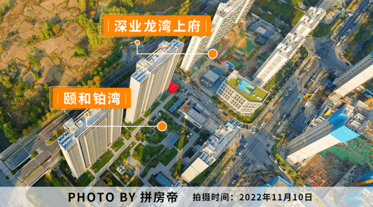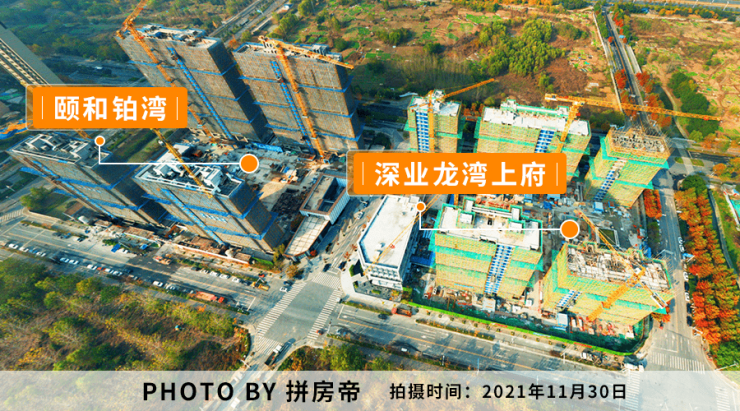 2021年11月底,颐和铂湾全部楼栋均已封顶,深业龙湾上府商业和3栋住宅楼封顶,当年6月未出地面的两栋楼也建得差不多了。