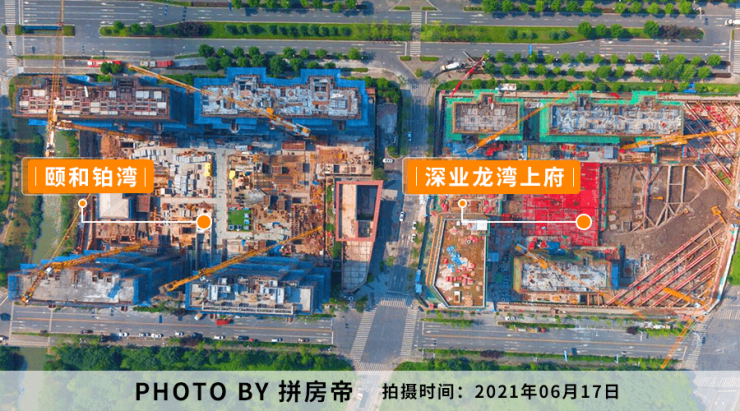 2021年6月中旬,颐和铂湾施工建筑出地面十几层;深业龙湾上府3栋住宅楼刚出地面,2栋住宅楼尚在打基地。