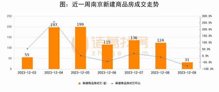 根据南京市住房保障和房产局数据显示,2023年12月09日南京新建商品房成交31套,较昨日减少93套,环比下降75%