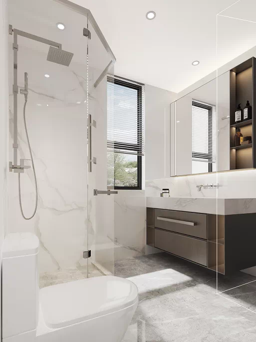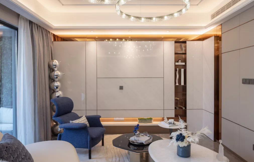 客厅背景墙采用的是南斯拉夫白大理石,低调不乏身份;卫生间也非常注重居住者的舒适度,选用高仪淋浴花洒、龙头,杜拉维特智能马桶,丽思卡尔顿酒店同品牌卡德维浴缸……